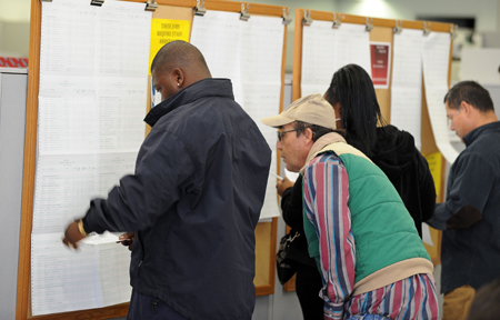 11月9日,在美國(guó)城市拉斯韋加斯,當(dāng)?shù)鼐用裨谝粋(gè)職業(yè)介紹中心里查看招聘信息。 據(jù)報(bào)道,美國(guó)勞工部上周的數(shù)據(jù)顯示,美國(guó)10月份凈增就業(yè)人數(shù)超過(guò)15萬(wàn)人,超過(guò)一些經(jīng)濟(jì)學(xué)家的預(yù)期。但美國(guó)眼下的失業(yè)率仍接近10%。