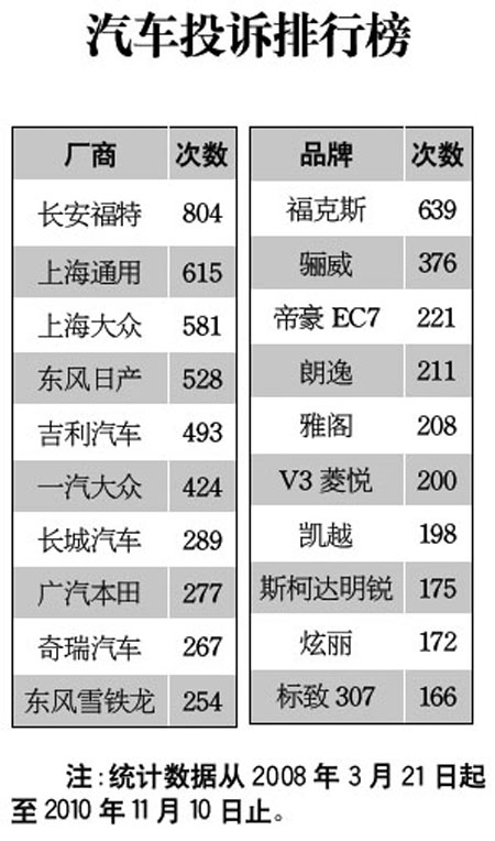 · 汽車投訴排行榜公布 長(zhǎng)安福特高居榜首 2010-09-16