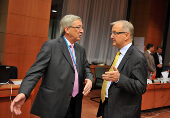 11月16日,歐元集團(tuán)主席、盧森堡首相容克(左)在比利時首都布魯塞爾舉行的歐元區(qū)財長會議上與歐盟委員會負(fù)責(zé)經(jīng)濟(jì)與貨幣事務(wù)的委員雷恩交談。當(dāng)天,歐元區(qū)財長會議在布魯塞爾舉行。由于近來愛爾蘭、葡萄牙等歐洲國家的債務(wù)形勢緊張,外界普遍擔(dān)心歐洲國家會陷入第二輪主權(quán)債務(wù)危機(jī)。新華社記者