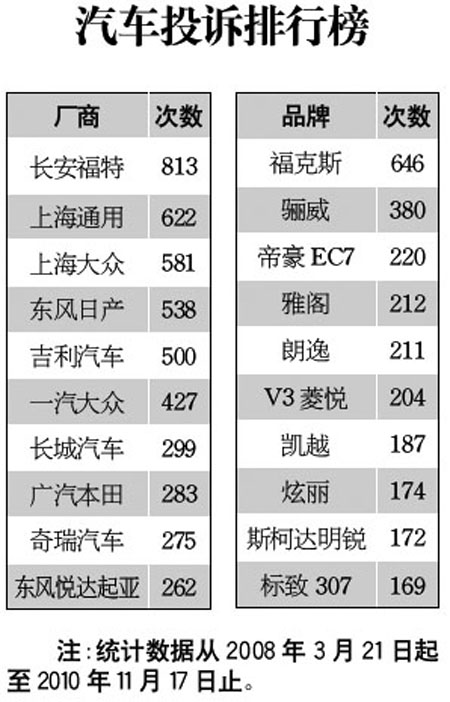 汽車投訴排行榜[2010-11-18]