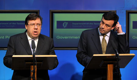 11月21日,愛爾蘭總理布賴恩·考恩(左)和財(cái)政部長(zhǎng)布賴恩·勒尼漢在首都都柏林出席記者招待會(huì)?级鳟(dāng)晚說,愛爾蘭向歐洲聯(lián)盟(歐盟)和國(guó)際貨幣基金組織(IMF)提出的一攬子金融援助請(qǐng)求已經(jīng)獲得歐盟的批準(zhǔn)(相關(guān)報(bào)道見四版)