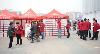 日前開幕的“2010河北省住宅產業(yè)現代化博覽會”上,不僅房地產開發(fā)商布展缺少了往日的奢華,前來咨詢看房的市民也不多。圖為一家房地產中介公司展位,工作人員聚在一起聊天,前來咨詢者寥寥。新華社記者