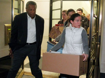 11月22日,F(xiàn)BI的工作人員突襲檢查了美國(guó)三家對(duì)沖基金的辦公室,并帶走了成箱的文件。這三家公司被認(rèn)為與一樁內(nèi)幕交易案件有關(guān)。圖為執(zhí)法人員搬走印有“證據(jù)”字樣的箱子。(路透社) |