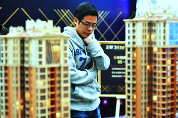 11月21日,市民在福州“住交會”一新開盤樓盤展臺前凝思。該樓盤均價為1.9萬元/平方米,最高為2.5萬元/平方米。新華社記者