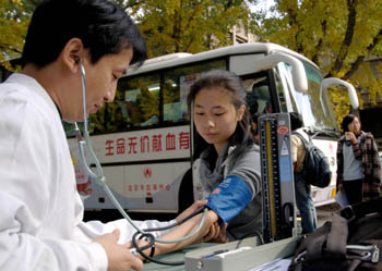 北大學(xué)子無(wú)償獻(xiàn)血應(yīng)對(duì)“血荒”。10月31日,北京大學(xué)校園內(nèi),剛滿(mǎn)18歲的學(xué)生韓旭測(cè)量血壓準(zhǔn)備獻(xiàn)血! ⌒氯A社發(fā)(趙琬微/攝) |