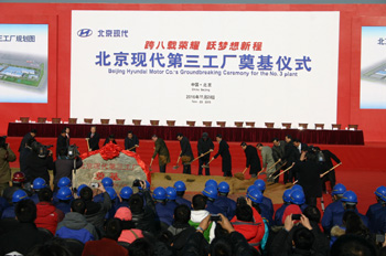 在順義區(qū)楊鎮(zhèn)工業(yè)開發(fā)區(qū),一座引領(lǐng)世界汽車工業(yè)新標(biāo)桿的現(xiàn)代化工廠——北京現(xiàn)代第三工廠破土奠基。第三工廠計劃于2012年下半年投產(chǎn),規(guī)劃的整車產(chǎn)能為40萬輛,相應(yīng)的發(fā)動機(jī)產(chǎn)能40萬臺。