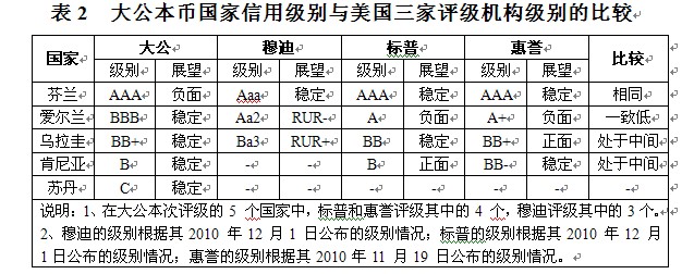 以5個國家的本幣信用級別為例,大公給出的級別與美國三家機構(gòu)存在明顯差異的國家是愛爾蘭,其他4個國家與三家機構(gòu)級別相同或處于三者之間。具體級別比較見表2
