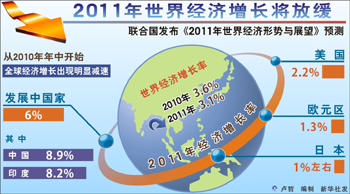 聯(lián)合國(guó)經(jīng)濟(jì)與社會(huì)事務(wù)部在其《2011年世界經(jīng)濟(jì)形勢(shì)與展望》報(bào)告也說(shuō),從2010年年中開(kāi)始,全球經(jīng)濟(jì)增長(zhǎng)出現(xiàn)明顯減速,2011年的增長(zhǎng)很可能將更加緩慢。