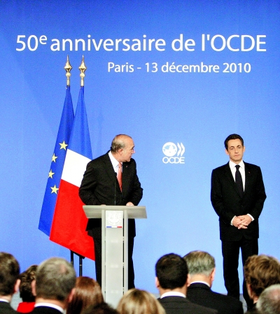 總部設(shè)在巴黎的經(jīng)濟(jì)合作與發(fā)展組織(簡稱“經(jīng)合組織”,OECD)13日在法國總統(tǒng)官邸愛麗舍宮舉辦成立50周年招待會。圖為經(jīng)合組織秘書長安赫爾·古里亞(左)和法國總統(tǒng)薩科齊在招待會上發(fā)表講話。該組織當(dāng)天公布的歐元區(qū)經(jīng)濟(jì)評估報(bào)告指出,歐元區(qū)貿(mào)易失衡和債務(wù)危機(jī)為后期經(jīng)濟(jì)發(fā)展蒙上陰影,目前地區(qū)層面的金融監(jiān)管和財(cái)政紀(jì)律都有待加強(qiáng)。經(jīng)合組織是成立于1961年的一個政府間國際組織,成員多為歐美和亞洲的經(jīng)濟(jì)發(fā)達(dá)國家。