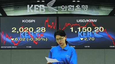 2010年12月20日,韓國外匯銀行的外匯交易員走過監(jiān)視屏。 受韓國當天在延坪島進行射擊訓練引發(fā)的朝鮮半島緊張局勢影響,全球多地股市應聲下跌,美元和黃金等避險產(chǎn)品價格再被推高。東京、首爾、新加坡、悉尼、中國香港、中國臺北等亞太地區(qū)主要股市下跌。韓國股市20日綜合股指下跌6.02點,報2020.28點,跌幅為0.3%。首爾外匯市場開盤韓元對美元匯率急跌,一度逼近1170比1。(詳見今日四版)