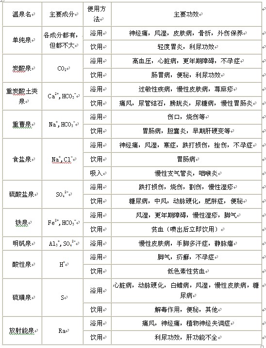 溫泉中含有豐富的礦物質(zhì),不僅對多種疾病均有療效作用,而且有保健、美容、護(hù)膚、療養(yǎng)之功效。通過浴用、飲用、吸入等多重用途,可以使您解除病痛,消除疲勞,煥發(fā)青春活力。