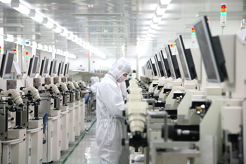 北京開發(fā)區(qū)星網(wǎng)工業(yè)園匯聚了全球20多家頂級(jí)通信企業(yè),形成了全球獨(dú)一無(wú)二的零庫(kù)存“星網(wǎng)模式”。圖為開發(fā)區(qū)威訊公司生產(chǎn)線。 |
