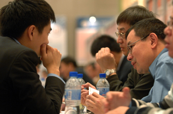 一名留學(xué)德國的創(chuàng)業(yè)項目負(fù)責(zé)人(右)在洽談會現(xiàn)場向國內(nèi)一家企業(yè)代表推介帶來的芯片開發(fā)技術(shù)項目!⌒氯A社記者 黃宗治
