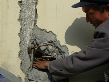 村民們一直擔(dān)心,質(zhì)量有問題的房子住了很難保證安全,“如果再發(fā)生地震,這樣的房子能挺住嗎?”村民現(xiàn)場(chǎng)為記者砸開墻體,發(fā)現(xiàn)磚與磚之間很多處根本沒有澆注砂石和水泥。
