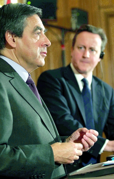 法國總理菲永(左)13日在倫敦和英國首相卡梅倫共同出席新聞發(fā)布會時表示,歐元區(qū)各成員國,尤其是德國和法國,愿意為了歐元區(qū)的經(jīng)濟(jì)穩(wěn)定竭盡所能。此前,菲永對英國《泰晤士報》表示,將敦促英國進(jìn)一步支持歐洲一體化以拯救歐元,否則,如果歐元崩潰,則英國將面臨自身經(jīng)濟(jì)陷入災(zāi)難的風(fēng)險。但卡梅倫當(dāng)天回應(yīng)說,英國將不會加入有關(guān)的歐元救助新機(jī)制。