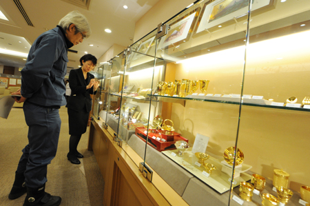 1月18日,在日本東京市中心的一家金店里,一位投資者購(gòu)買金條。在日本,由于對(duì)日幣和經(jīng)濟(jì)的擔(dān)心導(dǎo)致了黃金產(chǎn)品旺銷。近期有消息稱,到2015年,日本全國(guó)債務(wù)規(guī)模將達(dá)到GDP的250%,為世界最高。