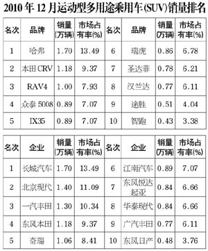 2010年12月運(yùn)動(dòng)型多用途乘用車(SUV)銷售12.62萬輛,環(huán)比下降4.93%,同比增長59.01%;12月銷量排名前10位的SUV品牌共銷售9.02萬輛,占SUV銷售總量的72%。