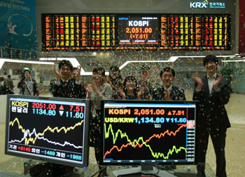 2010年12月30日,韓國(guó)首爾一家股市交易所內(nèi),工作人員們慶祝股市大漲。當(dāng)日,韓國(guó)綜合股指突破2050點(diǎn)大關(guān),再創(chuàng)全年新高。新華社發(fā) 樸真熙