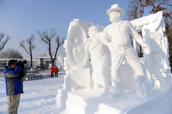 一位記者在拍攝第16屆哈爾濱國際雪雕比賽獲一等獎(jiǎng)的作品。記者 李勇