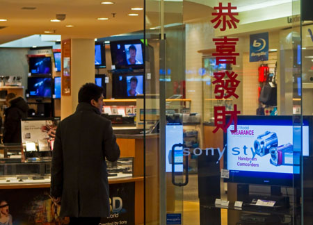 2月7日,加拿大多倫多地區(qū)的一家電器商店在玻璃門上貼出了中文春節(jié)賀詞。中國(guó)春節(jié)期間,多倫多地區(qū)的不少商家紛紛推出慶春節(jié)中文賀詞及廣告宣傳,吸引華人顧客。