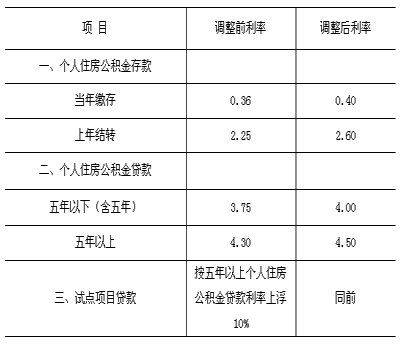一、從2011年2月9日起,上調(diào)個人住房公積金存款利率。當(dāng)年歸集的個人住房公積金存款利率上調(diào)0.04個百分點(diǎn),由0.36%上調(diào)至0.40%;上年結(jié)轉(zhuǎn)的個人住房公積金存款利率上調(diào)0.35個百分點(diǎn),由2.25%上調(diào)至2.60%。