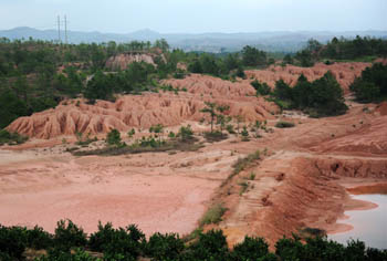 在江西信豐縣水土保持教育基地,因稀土開發(fā)留下的尾砂山和周圍臍橙園形成對(duì)比。新華社記者 周科