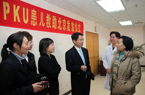 2011年1月30日,衛(wèi)生部婦幼保健與社區(qū)衛(wèi)生司兒童處處長(zhǎng)曹彬(右一)在活動(dòng)儀式上與美贊臣營(yíng)養(yǎng)品(中國(guó))有限公司華北區(qū)總經(jīng)理陳國(guó)憫(右三)交流。當(dāng)日,國(guó)內(nèi)首個(gè)以援助苯丙酮尿癥(簡(jiǎn)稱PKU)孩子為宗旨的“希望花開(kāi)基金”PKU患兒救助發(fā)放儀式在北京婦幼保健院舉行。據(jù)介紹,苯丙酮尿癥是一種先天性代謝疾病,可引起大腦及神經(jīng)系統(tǒng)損傷,為了免受智力損傷,PKU患者必須終生進(jìn)食人工合成的特殊事物,大部分PKU家庭因此陷入經(jīng)濟(jì)與精神的雙重困境!跋Mㄩ_(kāi)基金”的成立以及在全國(guó)開(kāi)展的“希望花開(kāi),愛(ài)捐行動(dòng)”,旨在呼吁更多人一起關(guān)注這個(gè)群體,并且給PKU孩子和家庭提供持續(xù)的援助。