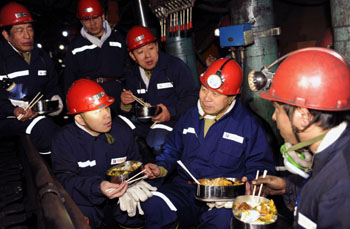 農(nóng)歷大年初一,山西焦煤汾西礦業(yè)集團(tuán)領(lǐng)導(dǎo)走進(jìn)新柳煤礦生產(chǎn)一線,為堅守生產(chǎn)崗位的礦工送來年飯,共進(jìn)午餐。記者 武敵/攝 |