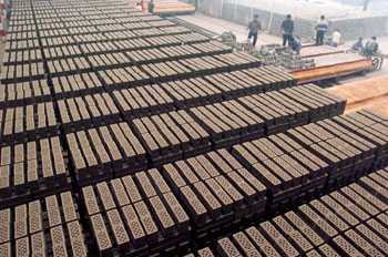 山西省陽泉市南煤集團投資2.4億元建成年產2.6億塊煤矸石免燒磚廠,以煤炭工業(yè)廢料煤矸石為主要原料,無需燃料,利用煤矸石自燃燒制成磚,每年可消耗煤矸石30余萬噸。不僅減少了污染,還有效利用了資源。資料照片 |