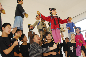 在由曾經(jīng)的“煤老板”武礦生成立的孝行文化傳播公司里,學(xué)員們正在學(xué)習(xí)皮影戲表演技巧。記者 燕雁