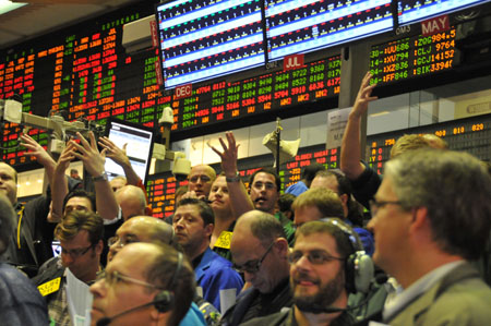 2月28日,工作人員在美國(guó)芝加哥商品交易所農(nóng)產(chǎn)品交易池忙碌。