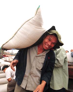 1月31日,在廣西東興邊民互市貿(mào)易區(qū),扛包工在搬運貨物。由于春節(jié)效應(yīng)使得近期中國對淀粉、芝麻的需求增加,碼頭處這兩種貨物的交易非常熱火。記者 黃孝邦/攝 |