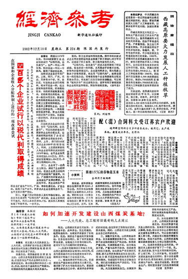 下邊的這張報樣是1982年12月10日《經(jīng)濟參考》(《經(jīng)濟參考報》前身)的一版,細心的讀者可能會發(fā)現(xiàn)在靠近頭版頭條的位置有兩枚篆刻印章,內(nèi)容是“慶祝五屆人大五次會議勝利閉幕”以及“熱烈歡呼新憲法莊嚴誕生”。1981年7月1日創(chuàng)刊的《經(jīng)濟參考報》正是以這種獨特的形式第一次報道了兩會。