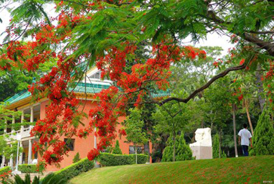 鳳凰花開始“燃燒”在枝頭,整個小島映照在一片絢爛中。駕著車在島上飛馳,路兩旁盛開著的鳳凰花在陽光下如火如荼地怒放著,就像一抹抹紅云飄浮在透徹的藍(lán)天下。