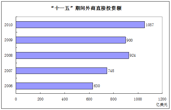 (一)利用外資規(guī)模躍居全球第二位。“十一五”期間,我國外商直接投資累計(jì)達(dá)到4260億美元,年均增長11.9%,是“十五”期間的1.6倍,全球排名由“十五”末的第四位上升至第二位,并連續(xù)18年位居發(fā)展中國家首位。2007年外商直接投資突破700億美元,2008年直接跨上900億美元臺(tái)階。即使是在國際金融危機(jī)沖擊較為嚴(yán)重的2009年,外商直接投資仍然超過900億美元,降幅遠(yuǎn)遠(yuǎn)低于全球平均水平。2010年,外商直接投資突破1000億美元,達(dá)到1057億美元,是“十五”末的1.8倍。