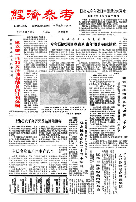1985年3月29日的頭版,《經(jīng)濟(jì)參考報(bào)》刊登了當(dāng)時(shí)的財(cái)政部部長(zhǎng)王丙乾,在六屆全國(guó)人大三次會(huì)議上宣讀的“關(guān)于1984年國(guó)家預(yù)算執(zhí)行情況和1985年國(guó)家預(yù)算草案的報(bào)告”的報(bào)道。這一天,對(duì)于《經(jīng)濟(jì)參考報(bào)》來(lái)說(shuō)是特殊的,因?yàn)檫@是本報(bào)關(guān)于“國(guó)家預(yù)算執(zhí)行情況和國(guó)家預(yù)算草案報(bào)告”的首次報(bào)道。