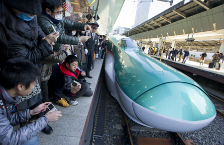 3月5日,在日本東京車站,“列車迷”爭(zhēng)睹新車。這列日本新干線速度最快的列車“隼”號(hào)現(xiàn)階段最高時(shí)速300公里,在首都東京與北部城市青森之間每天往返兩班,在東京與北部城市仙臺(tái)之間每天往返一班。
