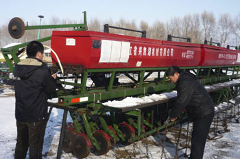 黑龍江墾區(qū)建設(shè)農(nóng)場(chǎng)第二管理區(qū)農(nóng)機(jī)工人在調(diào)試播種機(jī)。新華社發(fā)(周良君