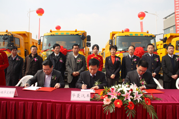 2011年3月2日上午,華菱公司隆重舉行了出口印尼150臺礦山自卸車的交接儀式,華菱公司董事長劉漢如還分別與華文國際董事長王民、印尼泛華總經(jīng)理王偉雄在交車儀式上簽訂了三方合作意向書,與華文國際董事長王民簽訂了合作框架書,承諾將在印尼重卡市場及其他國際市場的開發(fā)上共同努力,進行深入緊密合作。(陳會松