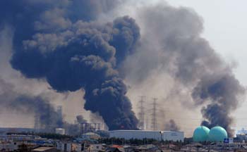 3月13日,滾滾濃煙從日本宮城縣多賀城的工業(yè)建筑物內(nèi)冒出。新華社/法新 |