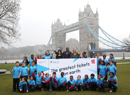 3月15日,在倫敦波特菲爾德公園內,前羅馬尼亞體操運動員科馬內奇(后排左五)、美國田徑運動員卡爾?劉易斯(后排左六)和英國游泳運動員阿德林頓(后排左七)與代表倫敦奧運會26個比賽項目的小學生,簇擁著一張巨型門票合影。當日,2012年倫敦奧運會門票正式開售!