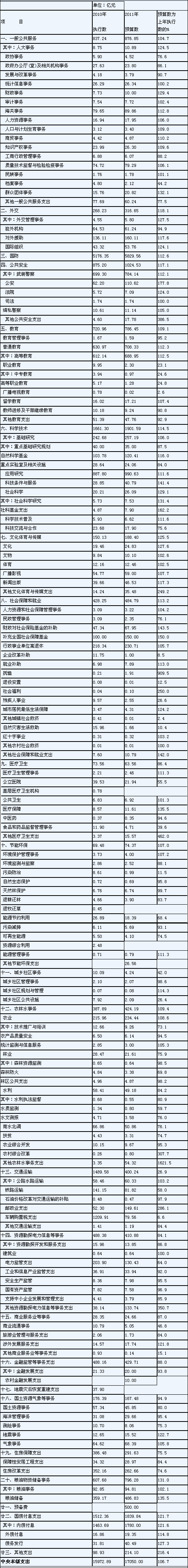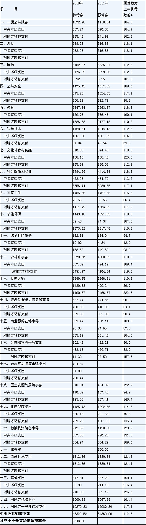 由于2011年政府支出科目發(fā)生變化,為了便于比較,2010年執(zhí)行數(shù)按2011年科目口徑做了調(diào)整,具體調(diào)整內(nèi)容詳見(jiàn)“2011年中央財(cái)政公共預(yù)算編表說(shuō)明”。
