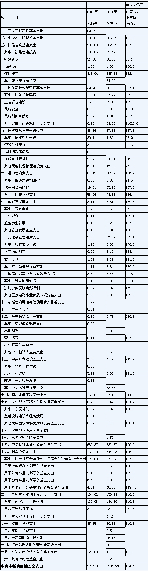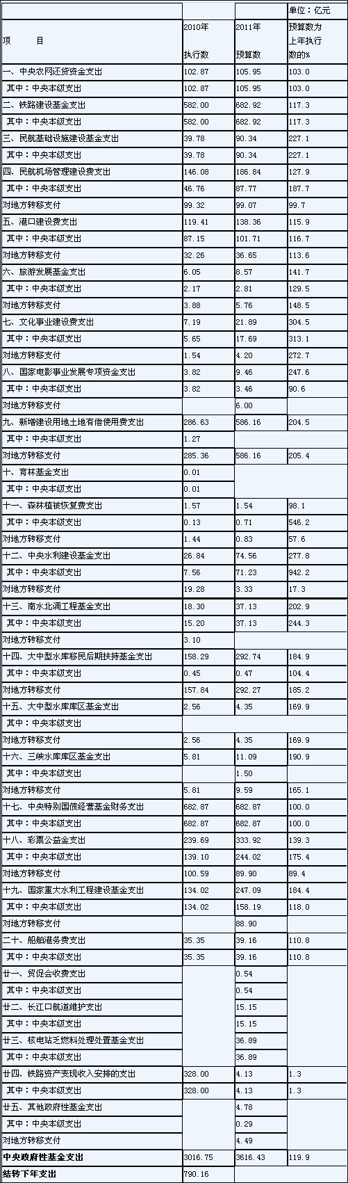 2011年中央政府性基金支出預(yù)算表
