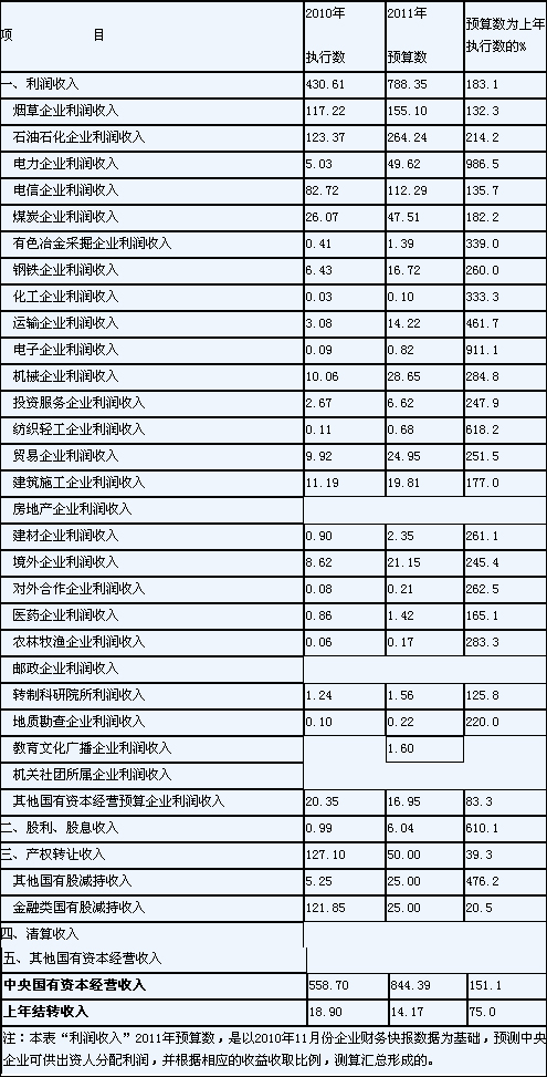 利潤收入788.35億元,加上股利、股息收入6.04億元,以及產(chǎn)權(quán)轉(zhuǎn)讓收入50億元,2011年中央國有資本經(jīng)營收入預(yù)算數(shù)為844.39億元。2010年結(jié)轉(zhuǎn)收入14.17億元。