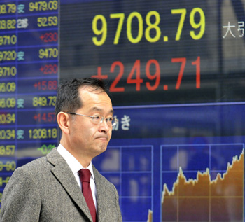 3月30日,在日本東京,行人經(jīng)過電子股價(jià)顯示屏。受日元匯率走低及前一個交易日紐約股市上漲等因素影響,30日東京股市日經(jīng)225種股票平均價(jià)格指數(shù)上漲2.64%,為11日大地震以來最高收盤值。