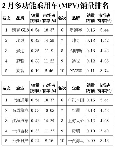 與上月相比,2月MPV品牌前10位中,森雅排名保持不變,上月第三的別克GL8上升為第一,而上月第一、第二位的瑞風、景逸分別退為第二、第三位;2月排名上升的有:菱智、奧德賽上升一位,帥克上升三位;排名下降的有:途安下降四位,普利馬、優(yōu)雅跌出前10。