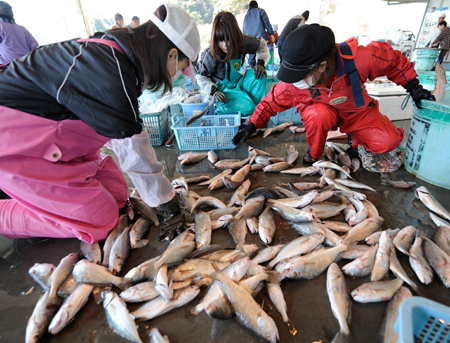 4月6日,人們?cè)谌毡敬某强h北茨城的一個(gè)魚(yú)市上分揀剛剛打撈的活魚(yú)。