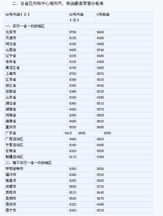 (一)成品油生產經營企業(yè)供軍隊及新疆生產建設兵團、國家儲備用汽、柴油(標準品,下同)供應價格每噸分別提高500元和400元,調整后的汽、柴油供應價格分別為每噸8580元和7730元。其他成品油價格相應調整。調整后的成品油標準品價格見附表一。非標準品價格由成品油生產經營企業(yè)按照國家規(guī)定的品質比率確定。 (二)供交通、民航等專項用戶汽、柴油最高供應價格等額提高。調整后的汽、柴油標準品最高供應價格每噸分別為8980元和8130元。非標準品最高供應價格由成品油生產經營企業(yè)按照國家規(guī)定的品質比率確定。其中,供鐵道、漁業(yè)、林業(yè)、農墾用汽、柴油價格暫按供軍隊用油價格執(zhí)行。 對符合資質的民營批發(fā)企業(yè)最高供應價格,按最高零售價格扣減400元確定。當市場零售價格降低時,對民營批發(fā)企業(yè)的供應價格也要相應降低,保持價差不小于400元。 具體供應價格可在不超過最高供應價格的前提下,由供需雙方協(xié)商確定。 (三)各地汽、柴油最高零售價格等額提高。調整后各省(區(qū)、市)和中心城市汽、柴油最高零售價格水平見附表二。各省(區(qū)、市)價格主管部門按規(guī)定的品質比率調整汽、柴油非標準品最高零售價格。 成品油零售企業(yè)可在不超過最高零售價格的前提下,自主制定具體零售價格。 (四)汽、柴油最高批發(fā)價格等額提高。合同約定由供方配送到零售企業(yè)的,最高批發(fā)價格按最高零售價格倒扣300元確定;合同未約定配送的,最高批發(fā)價格由各省(區(qū)、市)價格主管部門在300元的基礎上,再考慮運雜費因素確定。當市場零售價格降低時,批發(fā)價格也要相應降低,保持批零價差不小于300元。各省(區(qū)、市)價格主管部門按規(guī)定的品質比率制定非標準品最高批發(fā)價格。 成品油批發(fā)企業(yè)可在不超過最高批發(fā)價格的前提下,與零售企業(yè)協(xié)商確定具體批發(fā)價格。 (五)液化氣最高出廠價格按照與供軍隊等部門用90號汽油供應價格保持0.92:1的比價關系確定,供需雙方可在不超過最高出廠價格的前提下協(xié)商確定具體價格。 (六)調整后的價格自2011年4月7日零時起執(zhí)行。
