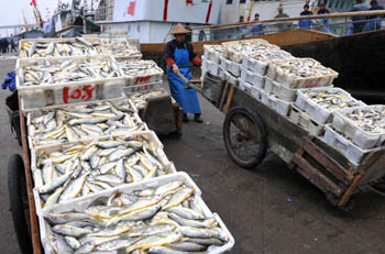 在浙江臺州海門港漁業(yè)市場碼頭,一車車鮮魚將被送往市場銷售。郟策