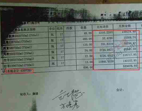 網(wǎng)上所公布的多張發(fā)票復(fù)印件顯示,此次被曝光的企業(yè)是“中國石油化工股份有限公司廣東石油分公司”,所進(jìn)酒水多為“拉菲”等名貴洋酒及高價茅臺酒。其中,僅一瓶拉菲1996(750ml)的無稅進(jìn)價就高達(dá)11846元。另一張貴州茅臺酒銷售有限公司所開的發(fā)票顯示,中石化廣東分公司一次性購買了近82萬元的茅臺酒。